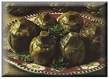 Tritate il prezzemolo, la menta, l'aglio ed uniteli al sale, al pepe e a mezzo bicchiere di olio. Aprite bene i carciofi, batteteli su un piano e sistematevi all'interno un po' del composto di prezzemolo, salate i carciofi all'esterno, uno ad uno, rigirandoli sul palmo della manosulla quale avrete messo il sale. Sistemate i carciofi capovolti e molto stretti tra loro in un tegame a bordi alti, in modo che possano cuocere con il gambo rivolto in su.